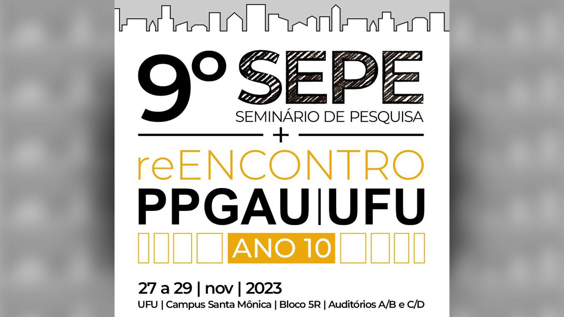 É com muita satisfação que o Programa de Pós-Graduação em Arquitetura e Urbanismo da UFU (PPGAU|UFU) vem lhe convidar para participar do 9º SEPE (Seminário de Pesquisa) + reENCONTRO PPGAU ANO 10.