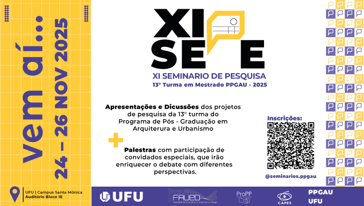 O XI SEPE – Seminário de Pesquisa do Programa de Pós-Graduação em Arquitetura e Urbanismo (PPGAU/UFU) é um espaço consolidado de debate acadêmico e troca de experiências, reunindo discentes, docentes e pesquisadores em torno da produção científica desenvolvida no Programa.